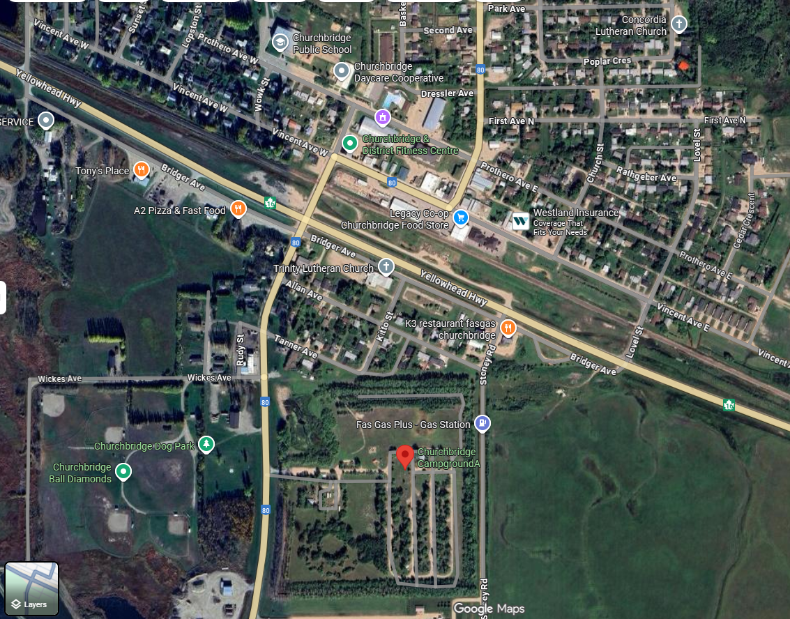 Located along Hwy 80 S/Raikes St S, the Churchbridge Campground is a beautiful, well established camping area with 33 sites, 29 of which are pull-through sites equipped with 30 amp electrical service. The remaining sites are reserved for tents.